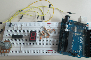 Controlar desde el Arduino, un Display LED DE 7-segmentos, a través de un IC 74HC595, para mostrar un numero de 0 a 9, dependiendo de la posición del Potenciometro.